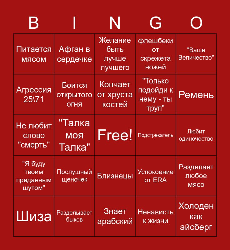 This bingo card has a free space and 24 words: Послушный щеночек, Разделывает быков, Кончает от хруста костей, Шиза, "Ваше Величество", Питается мясом, Агрессия 25\71, Афган в сердечке, Подстрекатель, Близнецы, "Только подойди к нему - ты труп", Не любит слово "смерть", Успокоение от ERA, Разделает любое мясо, Боится открытого огня, Ненависть к жизни, Любит одиночество, Желание быть лучше лучшего, Ремень, "Талка моя Талка", Холоден как айсберг, "Я буду твоим преданным шутом", флешбеки от скрежета ножей and Знает арабский.
