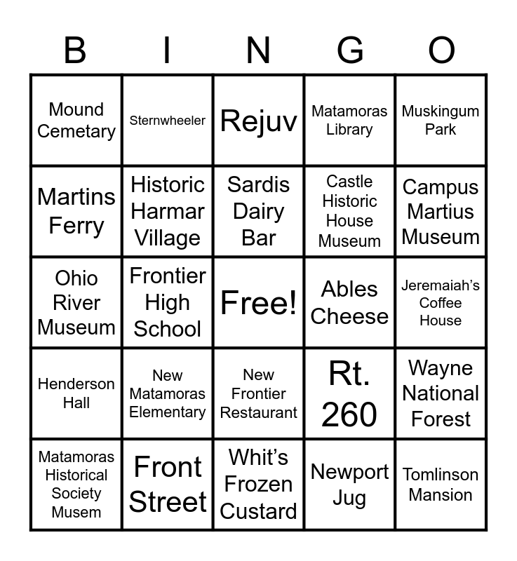 This bingo card has a free space and 24 words: New Matamoras Elementary, Front Street, Sardis Dairy Bar, Matamoras Historical Society Musem, Muskingum Park, Mound Cemetary, Martins Ferry, Sternwheeler, Ables Cheese, New Frontier Restaurant, Castle Historic House Museum, Ohio River Museum, Rt. 260, Wayne National Forest, Historic Harmar Village, Newport Jug, Jeremaiah’s Coffee House, Rejuv, Campus Martius Museum, Frontier High School, Tomlinson Mansion, Henderson Hall, Matamoras Library and Whit’s Frozen Custard.