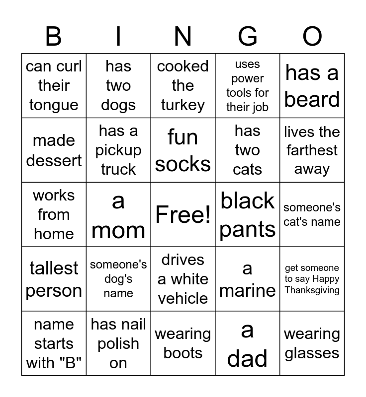 This bingo card has a free space and 31 words: wearing boots, middle name: Lawrence, a mom, a button up shirt, can curl their tongue, cooked the turkey, has a pickup truck, a marine, black pants, a dad, someone's cat's name, wearing glasses, wearing a watch, sitting on a chair with tree branches, lives the farthest away, shortest person, get someone to say Happy Thanksgiving, someone's dog's name, tallest person, drives a white vehicle, has a beard, can spot the leftover Christmas decoration, name starts with "B", has two dogs, has two cats, made dessert, uses power tools for their job, works from home, has nail polish on, fun socks and ate sweet potatoes.