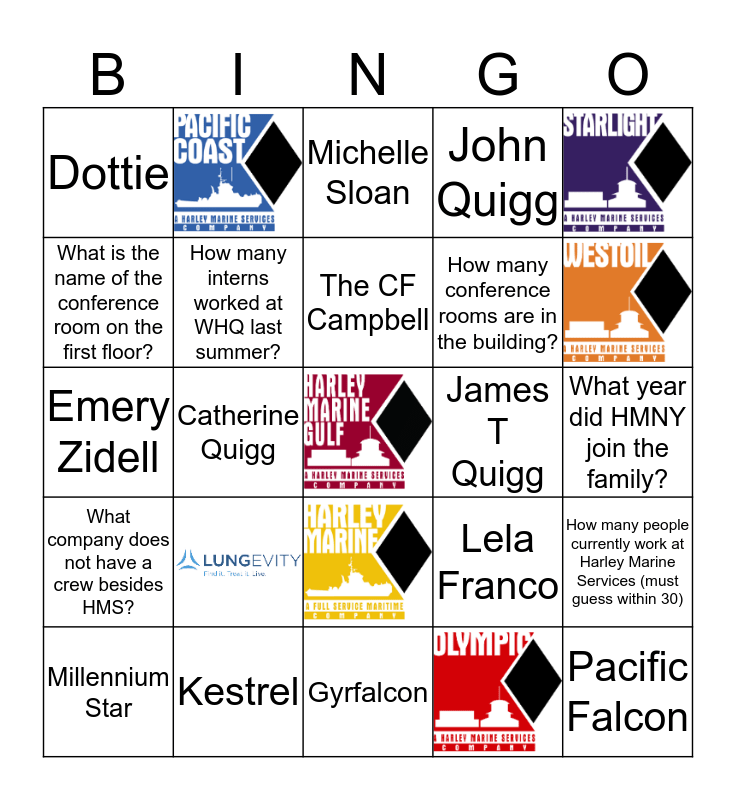 This bingo card has 7 images and 37 words: Robert Franco, Olympic Scout, Millennium Star, Millennium Falcon, Michelle Sloan, Lucy Franco, Kestrel, John Quigg, James T Quigg, Hunter D, Gyrfalcon, Ernest Campbell, Emery Zidell, The Eagle, Bob Franco, Ahbra Franco, Dottie, What is the right side of a boat called?, What year did HMNY join the family?, What company does the Trigger fall under?, How much did the golf tournament raise this year?, Lela Franco, What company does not have a crew besides HMS?, What was the original color of the logo for SMS?Who is the GM in HMNY?, How many people currently work at Harley Marine Services (must guess within 30), What is the only company that does not have a diamond in the logo?, What is the left side of a boat called?, Catherine Quigg, Jake Shearer, Millennium Dawn, Pacific Falcon, The CF Campbell, What is the name of the conference room on the first floor?, How many conference rooms are in the building?, Tuna ___________?, How many interns worked at WHQ last summer? and 65 Roses.