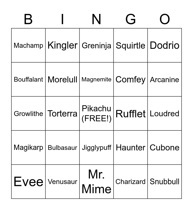 This bingo card has a free space and 45 words: Psyduck, Snubbull, Ditto, Evee, Flareon, Charizard, Greninja, Charmander, Dodrio, Venusaur, Squirtle, Rufflet, Jigglypuff, Bulbasaur, Aipom, Mr. Mime, Lickitung, Growlithe, Ludicolo, Arcanine, Kingler, Slaking, Snorlax, Machamp, Pigeot, Loudred, Blastoise, Gengar, Haunter, Magikarp, Gyarados, Cubone, Rattata, Treecko, Mewtwo, Torterra, Graveler, Togepi, Totodile, Magnemite, Bouffalant, Comfey, Pancham, Morelull and Pangoro.