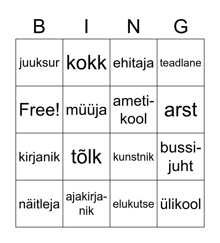 This bingo card has 16 words: ajakirja- nik, bussi-juht, ehitaja, juuksur, kirjanik, kokk, kunstnik, elukutse, Free!, müüja, näitleja, teadlane, tõlk, arst, ameti- kool and ülikool.