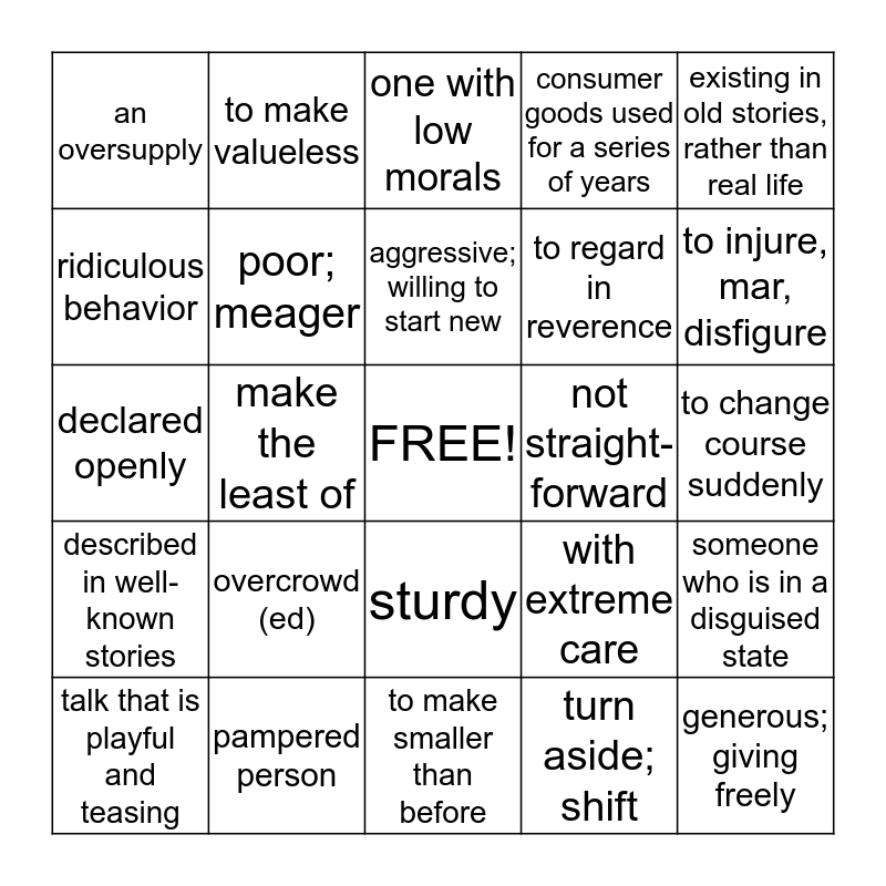 This bingo card has a free space and 24 words: overcrowd (ed), pampered person, aggressive; willing to start new, talk that is playful and teasing, existing in old stories, rather than real life, an oversupply, ridiculous behavior, to make valueless, not straight- forward, sturdy, to regard in reverence, declared openly, with extreme care, someone who is in a disguised state, poor; meager, turn aside; shift, to change course suddenly, one with low morals, to injure, mar, disfigure, make the least of, generous; giving freely, described in well-known stories, consumer goods used for a series of years and to make smaller than before.