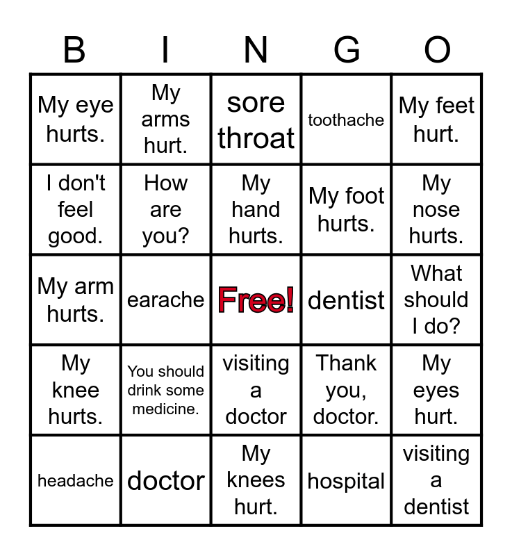 This bingo card has a free space and 24 words: headache, You should drink some medicine., My hand hurts., hospital, My feet hurt., My eye hurts., My arms hurt., sore throat, dentist, What should I do?, My arm hurts., How are you?, Thank you, doctor., My eyes hurt., I don't feel good., doctor, My knees hurt., toothache, My nose hurts., My knee hurts., earache, visiting a doctor, My foot hurts. and visiting a dentist.