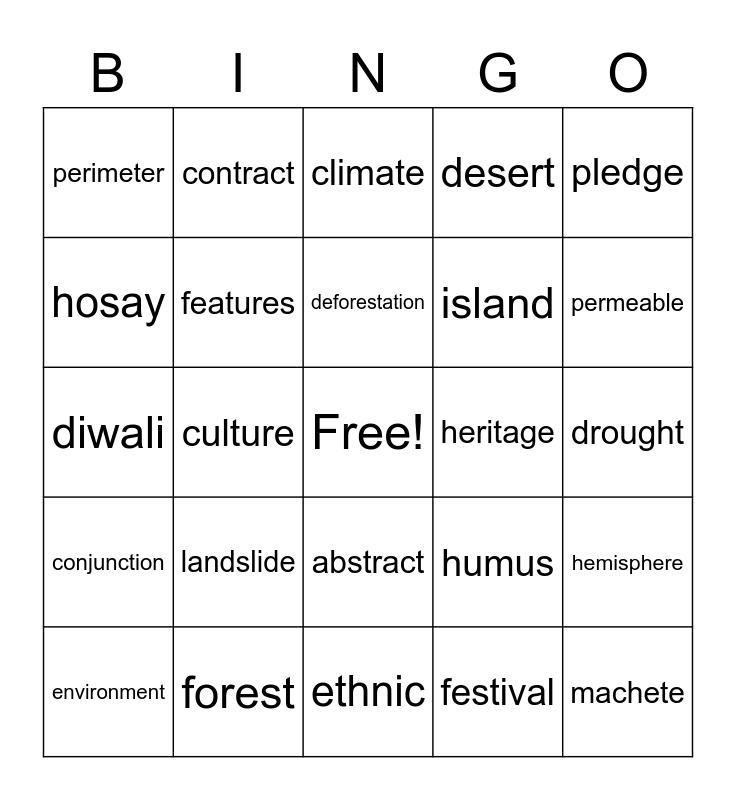 This bingo card has a free space and 29 words: environment, disease, culture, soil, perimeter, climate, features, landslide, heritage, forest, drought, machete, ethnic, festival, permeable, contaminate, abstract, conjunction, pledge, diwali, humus, global, island, hosay, desert, contract, hemisphere, deforestation and habitat.
