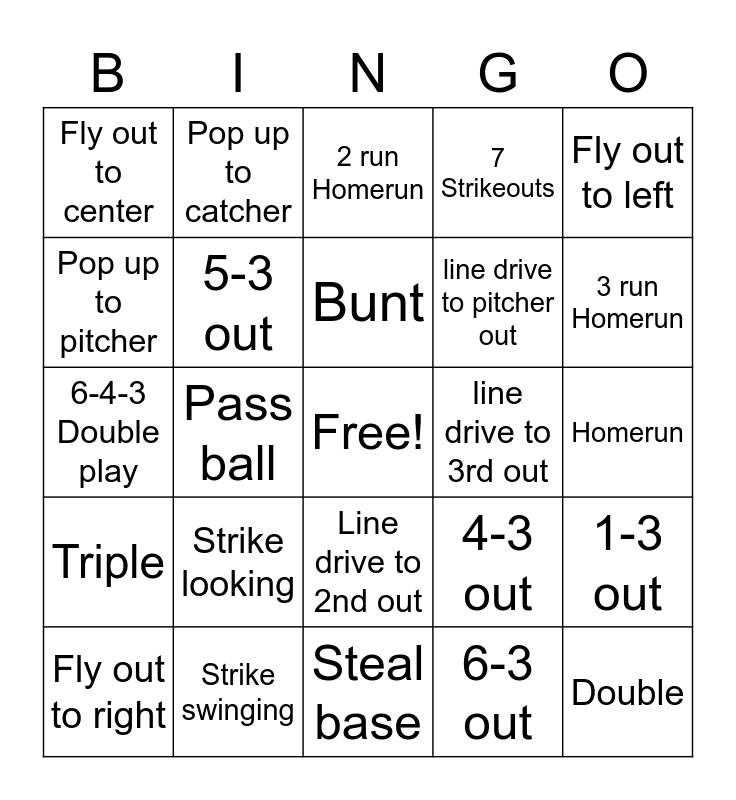 This bingo card has a free space and 24 words: Strike looking, Strike swinging, Bunt, Fly out to right, Fly out to left, Fly out to center, Pop up to pitcher, Pop up to catcher, line drive to 3rd out, Line drive to 2nd out, line drive to pitcher out, 6-4-3 Double play, 4-3 out, 1-3 out, 5-3 out, 6-3 out, Homerun, 2 run Homerun, 3 run Homerun, Pass ball, Double, Triple, 7 Strikeouts and Steal base.