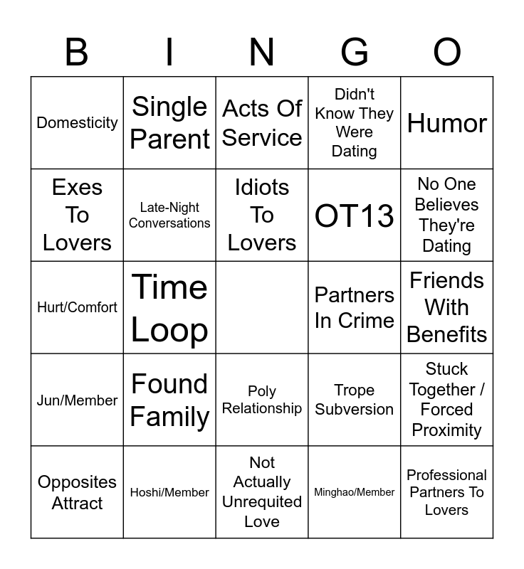 This bingo card has a free space and 79 words: 3+1 / 5+1 Things, Accidental Relationship, Acts Of Service, Actually Fake Dating, Arranged Marriage, Bad Flirting, Banter / Bickering, Based On Other Media, Character Study, Childhood Friends, Childhood Friends To Lovers, Confessions, Didn't Know They Were Dating, Domesticity, Established Relationship, Exes To Lovers, Fake Relationship, Found Family, Friends To Lovers, Friends With Benefits, Happy Ending, Humor, Hurt/Comfort, Idiots To Lovers, Late-Night Conversations, Love Languages, Marriage Of Convenience, Meddling / Matchmaking, Morally Gray Characters, Mutual Pining, No One Believes They're Dating, Non-Linear Narrative, Not Actually Unrequited Love, Only One Bed, Opposites Attract, Partners In Crime, Pining, Polyamory, Practice Kissing, Professional Partners To Lovers, Right Person Wrong Time, Romcom, Roommates, Secret Relationship, Sharing Dreams, Single Parent, Slice Of Life, Slow Burn, Soulmates, Strangers To Lovers, Stuck Together / Forced Proximity, Time Loop, Trope Subversion, Unrequited Love, Unrequited Rivalry, Very Obvious A Very Oblivious B, We Kissed Once But We Don't Talk About It, Wound Tending, Monogamous Relationship, Poly Relationship, OT13, 95 Line, 96 Line, 97 Line, Foreign Line, Leaders, Seungcheol/Member, Jeonghan/Member, Joshua/Member, Jun/Member, Hoshi/Member, Wonwoo/Member, Woozi/Member, Dokyeom/Member, Mingyu/Member, Minghao/Member, Seungkwan/Member, Vernon/Member and Dino/Member.
