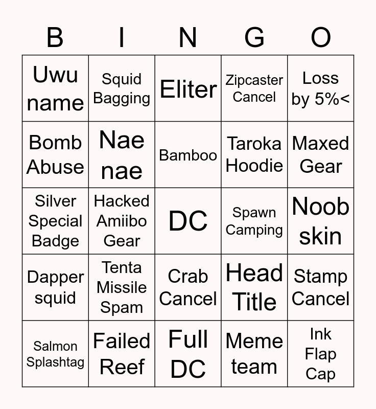 This bingo card has a free space and 24 words: Tenta Missile Spam, Failed Reef, Bamboo, Salmon Splashtag, Loss by 5%<, Uwu name, Bomb Abuse, Squid Bagging, Spawn Camping, Crab Cancel, Taroka Hoodie, Silver Special Badge, Head Title, Stamp Cancel, Nae nae, Meme team, Noob skin, Eliter, Maxed Gear, Hacked Amiibo Gear, Ink Flap Cap, Dapper squid, Zipcaster Cancel and Full DC.