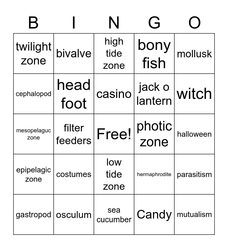 This bingo card has a free space and 36 words: shark, commensalism, gills, head foot, hermaphrodite, epipelagic zone, casino, porifera, mollusk, thermocline, filter feeders, bony fish, stomach foot, photic zone, witch, twilight zone, organic food, costumes, mutualism, high tide zone, halloween, parasitism, osculum, gastropod, sea cucumber, bivalve, mesopelaguc zone, star fish, jack o lantern, cephalopod, collar cells, vampire fish, Candy, low tide zone, Quiz and trick or treat.