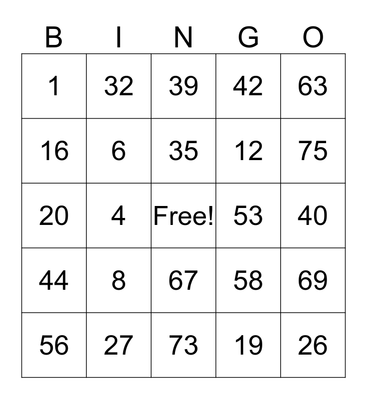 This bingo card has a free space and 24 words: 8, 27, 35, 56, 63, 1, 16, 32, 53, 67, 12, 20, 58, 69, 6, 19, 40, 39, 75, 4, 26, 44, 42 and 73.