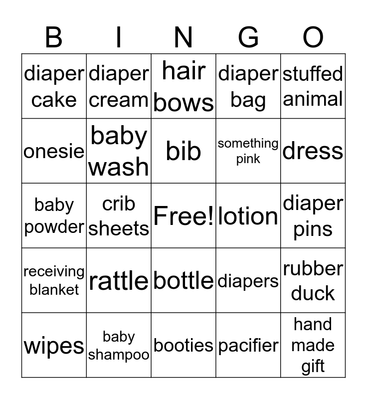 This bingo card has a free space and 24 words: rattle, baby shampoo, bib, wipes, stuffed animal, diaper cake, onesie, diaper cream, lotion, bottle, something pink, baby powder, diapers, rubber duck, baby wash, pacifier, diaper pins, hair bows, dress, crib sheets, hand made gift, receiving blanket, diaper bag and booties.