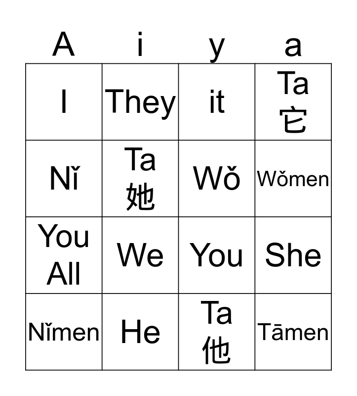 This bingo card has 16 words: He, She, it, I, You All, They, You, Ta 他, Nǐ, Ta 她, Nǐmen, Ta 它, We, Wǒmen, Wǒ and Tāmen.