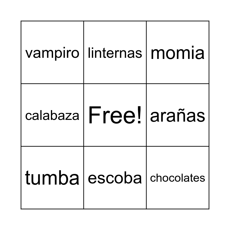 This bingo card has a free space and 11 words: murciélagos, escoba, chocolates, tumba, linternas, momia, calabaza, espantapájaros, arañas, vampiro and bruja.