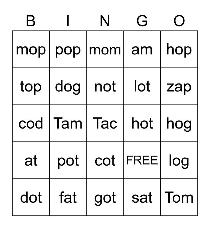 This bingo card has 25 words: pot, got, not, dot, hop, mop, top, pop, hot, cot, lot, cod, FREE, log, dog, Tom, hog, mom, zap, Tam, Tac, fat, at, am and sat.