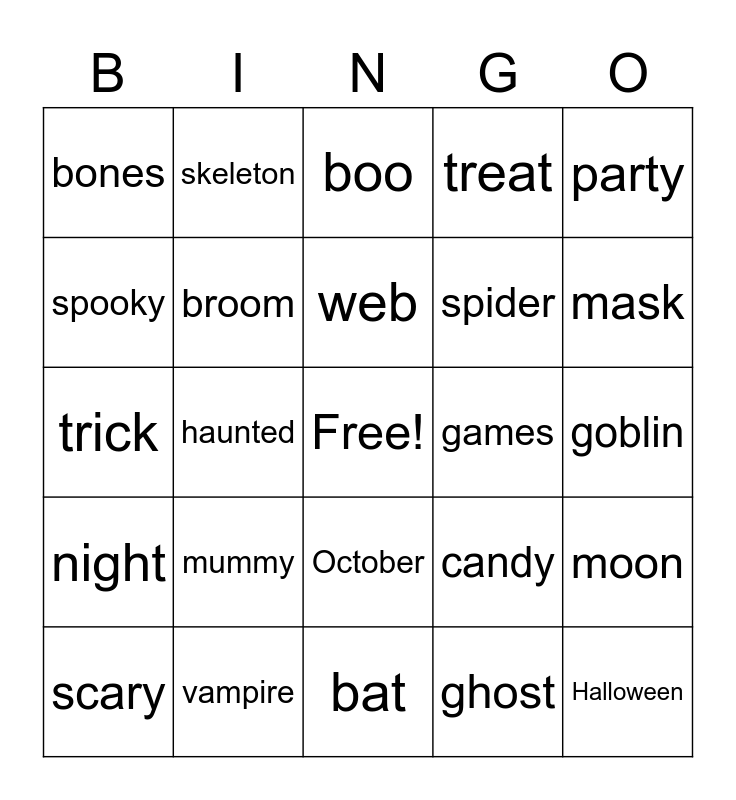 This bingo card has a free space and 31 words: bat, cauldron, haunted, black, bones, boo, broom, candy, games, ghost, goblin, Halloween, howl, jack-o-lantern, mask, monster, moon, mummy, night, October, party, pumpkin, scary, skeleton, spider, spooky, treat, trick, vampire, web and witch.
