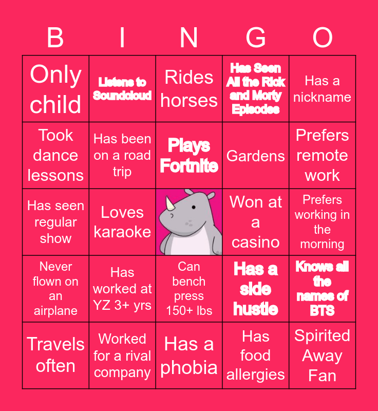 This bingo card has a free space and 29 words: Travels often, Knows a Sponge Bob Quote, Loves karaoke, Is left-handed, Only child, Rides horses, Has been on a road trip, Has worked at YZ 3+ yrs, Won at a casino, Worked for a rival company, Prefers working in the morning, Spirited Away Fan, Has a phobia, Has food allergies, Prefers remote work, Wearing funny socks, Can bench press 150+ lbs, Never flown on an airplane, Has a nickname, Has seen regular show, Has a side hustle, Loves true crime podcasts, Gardens, Took dance lessons, Has Seen All the Rick and Morty Episodes, Listens to Soundcloud, Knows all the names of BTS, Plays Fortnite and Has seen Coraline.