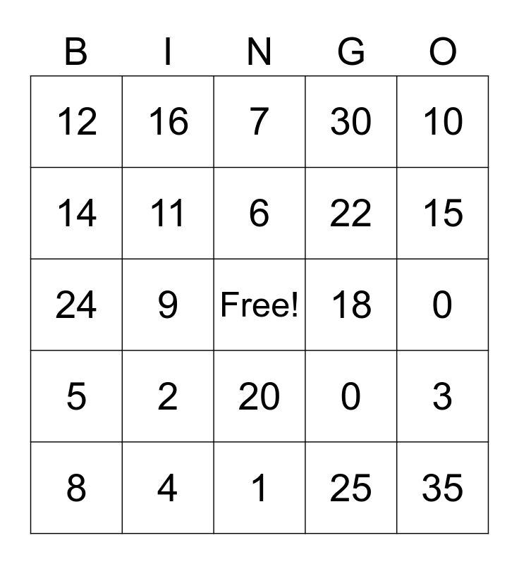 This bingo card has a free space and 24 words: 2, 4, 6, 8, 10, 12, 14, 16, 18, 20, 22, 24, 0, 3, 11, 25, 0, 7, 15, 9, 35, 5, 30 and 1.