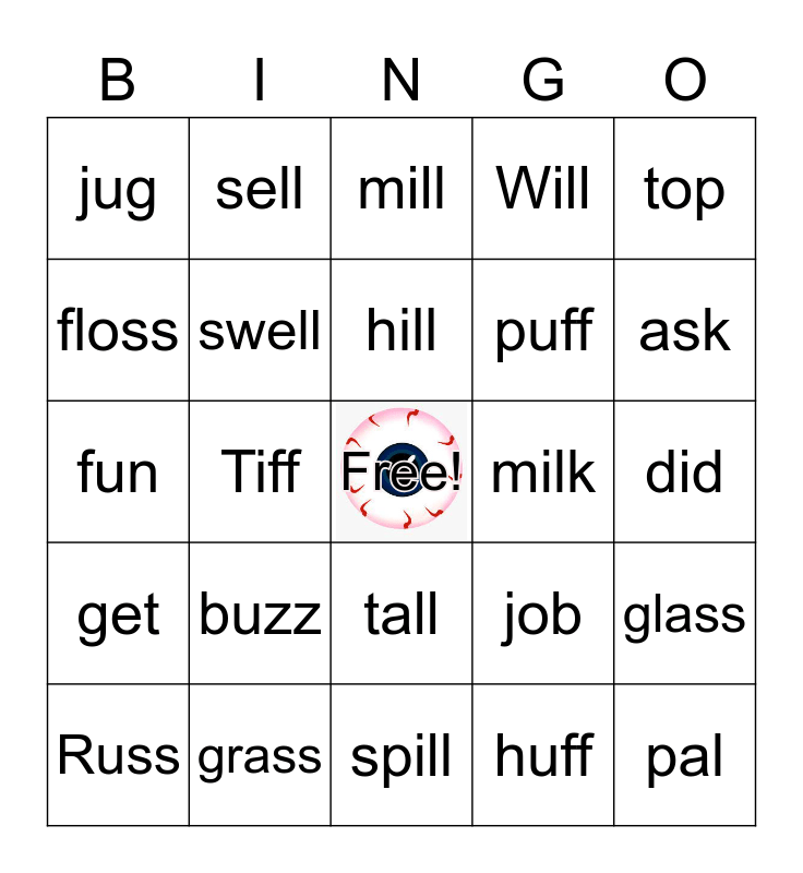 This bingo card has a free space and 24 words: buzz, grass, hill, Russ, top, jug, floss, sell, milk, tall, puff, fun, job, glass, swell, huff, did, mill, ask, Tiff, pal, get, Will and spill.