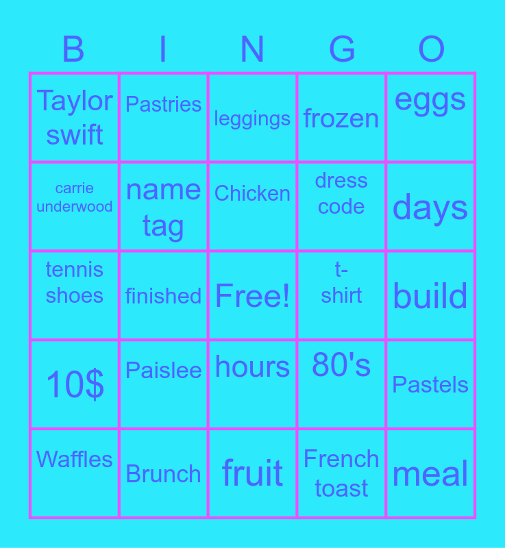 This bingo card has a free space and 24 words: Paislee, Brunch, Chicken, Waffles, eggs, Taylor swift, carrie underwood, Pastries, t-shirt, hours, dress code, tennis shoes, 80's, Pastels, name tag, French toast, build, leggings, days, finished, meal, 10$, frozen and fruit.