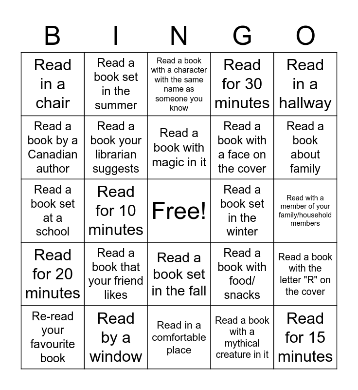 This bingo card has a free space and 24 words: Read a book that your friend likes, Read by a window, Read a book with magic in it, Re-read your favourite book, Read in a hallway, Read in a chair, Read a book by a Canadian author, Read a book set in the summer, Read a book set in the winter, Read a book set in the fall, Read a book with a face on the cover, Read a book set at a school, Read a book with food/ snacks, Read a book with the letter "R" on the cover, Read a book your librarian suggests, Read a book with a mythical creature in it, Read with a member of your family/household members, Read a book with a character with the same name as someone you know, Read a book about family, Read for 10 minutes, Read for 15 minutes, Read for 20 minutes, Read for 30 minutes and Read in a comfortable place.