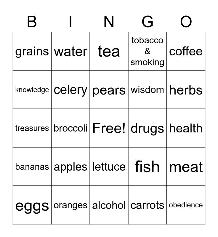 This bingo card has a free space and 24 words: apples, oranges, pears, eggs, coffee, grains, knowledge, water, drugs, lettuce, wisdom, treasures, fish, meat, celery, carrots, health, tea, herbs, broccoli, obedience, bananas, tobacco & smoking and alcohol.