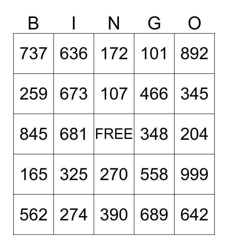 This bingo card has a free space and 24 words: 325, 274, 107, 562, 892, 737, 259, 636, 348, 270, 466, 845, 558, 999, 673, 689, 204, 172, 345, 681, 642, 165, 101 and 390.