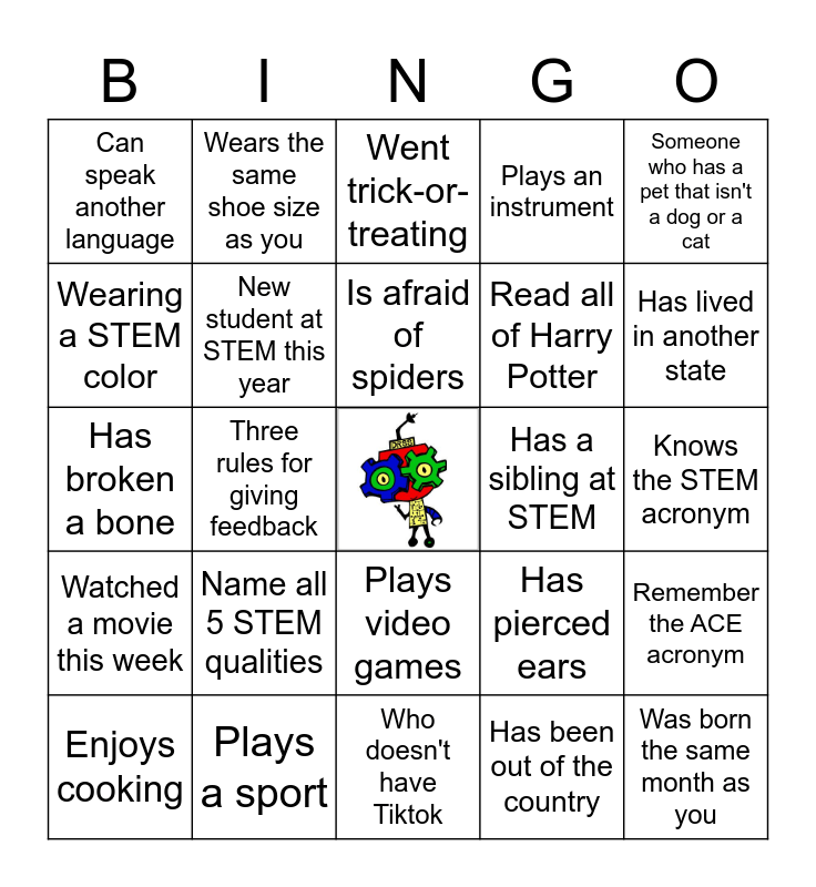 This bingo card has a free space and 24 words: Name all 5 STEM qualities, Plays a sport, Is afraid of spiders, Enjoys cooking, Someone who has a pet that isn't a dog or a cat, Can speak another language, Wearing a STEM color, Wears the same shoe size as you, Has a sibling at STEM, Plays video games, Read all of Harry Potter, Has broken a bone, Has pierced ears, Remember the ACE acronym, New student at STEM this year, Has been out of the country, Knows the STEM acronym, Went trick-or-treating, Has lived in another state, Three rules for giving feedback, Was born the same month as you, Watched a movie this week, Plays an instrument and Who doesn't have Tiktok.