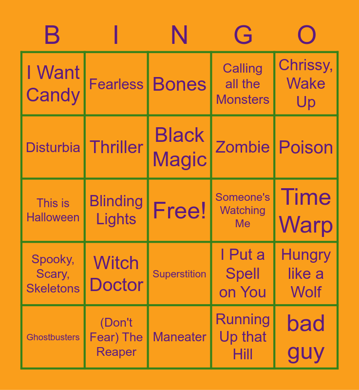 This bingo card has a free space and 29 words: Ghostbusters, This is Halloween, Blinding Lights, You Spin Me Round, I Want Candy, Bones, Thriller, Witch Doctor, Someone's Watching Me, (Don't Fear) The Reaper, Time Warp, bad guy, Maneater, Running Up that Hill, Poison, Monster Mash, Superstition, Spooky, Scary, Skeletons, Chrissy, Wake Up, This is Halloween, I Put a Spell on You, Sweet Dreams, Zombie, Disturbia, Calling all the Monsters, Fearless, Hungry like a Wolf, Black Magic and E.T..