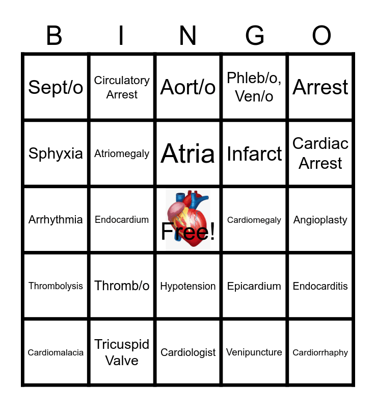 This bingo card has a free space and 80 words: Aneurysm/o, Angi/o, Vascul/o, Aort/o, Arteri/o, Arteriol/o, Artri/o, Ather/o, Brady, Cardi/o, Electr/o, Embol/o, Hemangi/o, My/o, Phleb/o, Ven/o, Sept/o, Sphygm/o, Sphyxia, Tachy, Thromb/o, Ventricul/o, Angioplasty, Aortic Semilunar Valve, Arrest, Arrhythmia, Atria, Atriomegaly, Atrioseptoplasty, Bicuspid Valve, Bradycardia, Bruit, Cardiac Apex, Cardiac Arrest, Cardiodynia, Cardiologist, Cardiology, Cardiomalacia, Cardiomegaly, Cardiomyopathy, Cardiopathy, Cardioplegia, Cardiorrhaphy, Cardiorrhexis, Cardiotomy, Cardiovascular, Cardioversion, Carditis, Circulatory Arrest, Coarctation, Deoxygenated, Embolus, Endarterial, Endocarditis, Endocardium, Epicardium, Fibrillation, Heart, Hemangioma, Hemostasis, Hyperlipdemia, Hypertension, Hypotension, Infarct, Ischemia, Lumen, Myocardium, Oxygenated, Palpitation, Pericardial Fluid, Pericardiocentesis, Pericardium, Tachycardia, Thrombolysis, Tricuspid Valve, Troponin, Valvoplasty, Valvotomy, Valvulitis, Venipuncture, Venography, Ventricles and Ventriculoplasty.