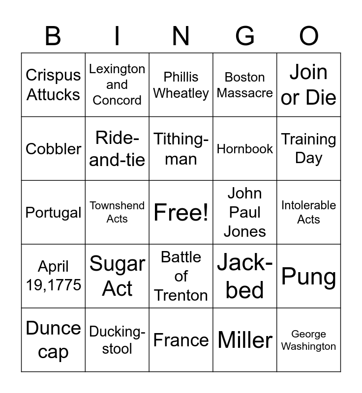 This bingo card has a free space and 54 words: 1492, April 19,1775, July 4, 1776, October 19, 1781, Battle of Trenton, Battle of Yorktown, Boston Massacre, Boston Tea Party, Cobbler, Cooper, Crispus Attucks, Declaration of Independence, Ducking-stool, Dunce cap, Enlightenment, France, George Washington, Hornbook, Iberian, Intolerable Acts, Jack-bed, James Armistead Lafayette, John Paul Jones, Join or Die, Land, Lexington and Concord, Log bridge, Marquis de Lafayette, Meetinghouse, Miller, Nathan Hale, One, Patrick Henry, Paul Revere, Phillis Wheatley, Pod, Portugal, Pung, Quartering Act, Ride-and-tie, Saltbox, Spain, Stamp Act, Stocks, Sugar Act, Tanner, Taxation without representation, Thomas Jefferson, Tithing-man, Townshend Acts, Training Day, Trundle bed, Valley Forge and Watchman.