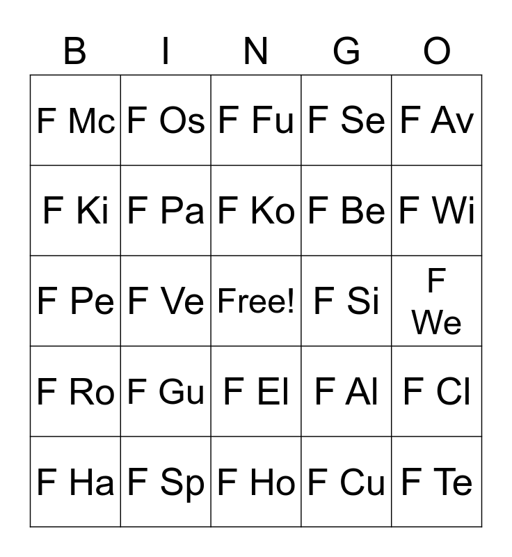 This bingo card has a free space and 42 words: F Co, F Ko, F Lu, F Gu, F Cu, F Cl, F Te, F Ta, F Fu, F El, F We, F Wi, F Ve, F Av, F Ap, F Al, F Cr, F Pe, F Gr, F Os, F Ki, F Da, F Di, F Mc, F Mi, F Ba, F Be, F Br, F Ri, F Bl, F Dr, F Ro, F Pa, F Ho, F Hu, F Ha, F Sp, F Si, F Sc, F Su, F Se and F Sm.