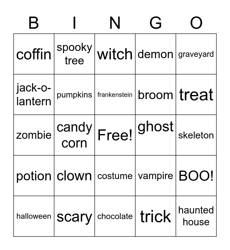 This bingo card has a free space and 29 words: halloween, full moon, candy corn, spider web, coffin, witch, pumpkins, clown, ghost, scary, skeleton, haunted house, chocolate, trick, treat, black cat, costume, potion, graveyard, zombie, vampire, bat, broom, jack-o-lantern, demon, spooky tree, BOO!, frankenstein and mummy.