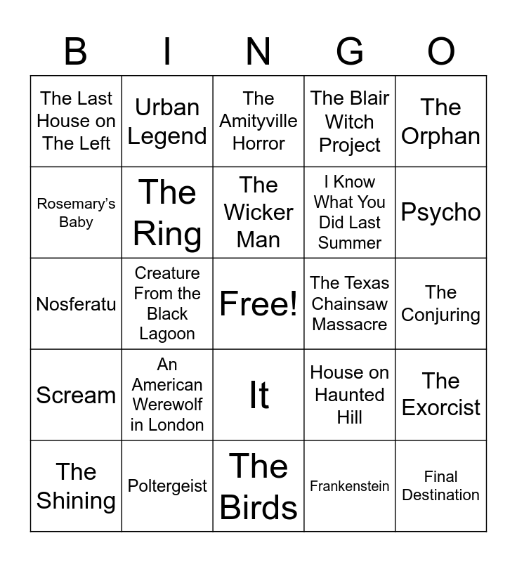 This bingo card has a free space and 28 words: The Exorcist, Halloween, I Know What You Did Last Summer, Frankenstein, Rosemary’s Baby, The Amityville Horror, Urban Legend, Scream, The Texas Chainsaw Massacre, The Shining, Nosferatu, The Blair Witch Project, Poltergeist, The Birds, Psycho, Carrie, An American Werewolf in London, The Ring, The Wicker Man, It, The Last House on The Left, The Strangers, Final Destination, Creature From the Black Lagoon, The Conjuring, House on Haunted Hill, The Orphan and It Comes at Night.