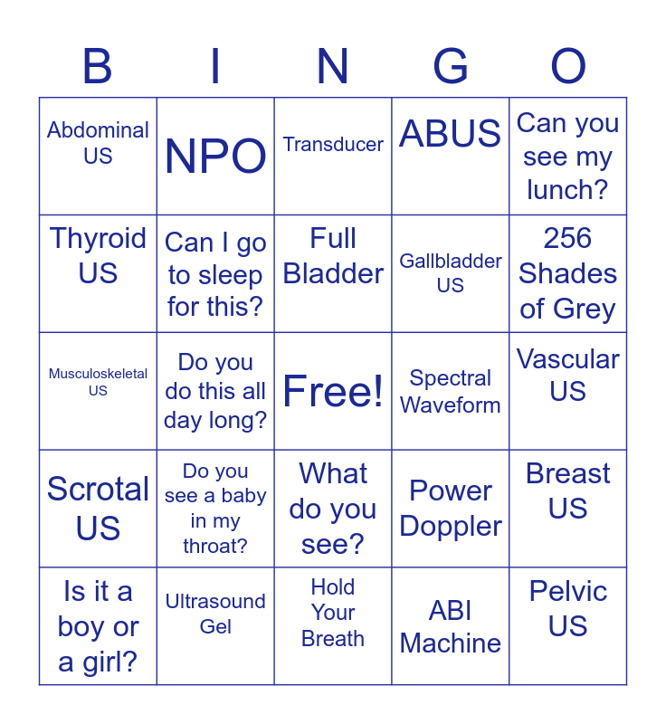 This bingo card has a free space and 24 words: Do you see a baby in my throat?, Ultrasound Gel, Full Bladder, Is it a boy or a girl?, Can you see my lunch?, Abdominal US, Thyroid US, NPO, Spectral Waveform, What do you see?, Gallbladder US, Musculoskeletal US, Power Doppler, Breast US, Can I go to sleep for this?, ABI Machine, Vascular US, Transducer, 256 Shades of Grey, Do you do this all day long?, Pelvic US, Scrotal US, ABUS and Hold Your Breath.