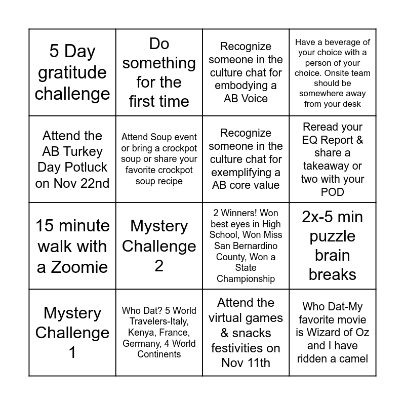 This bingo card has 16 words: Who Dat? 5 World Travelers-Italy, Kenya, France, Germany, 4 World Continents, 2x-5 min puzzle brain breaks, Recognize someone in the culture chat for embodying a AB Voice, 5 Day gratitude challenge, 15 minute walk with a Zoomie, Do something for the first time, 2 Winners! Won best eyes in High School, Won Miss San Bernardino County, Won a State Championship, Attend the virtual games & snacks festivities on Nov 11th, Attend the AB Turkey Day Potluck on Nov 22nd, Attend Soup event or bring a crockpot soup or share your favorite crockpot soup recipe, Mystery Challenge 1, Have a beverage of your choice with a person of your choice. Onsite team should be somewhere away from your desk, Mystery Challenge 2, Reread your EQ Report & share a takeaway or two with your POD, Recognize someone in the culture chat for exemplifying a AB core value and Who Dat-My favorite movie is Wizard of Oz and I have ridden a camel.