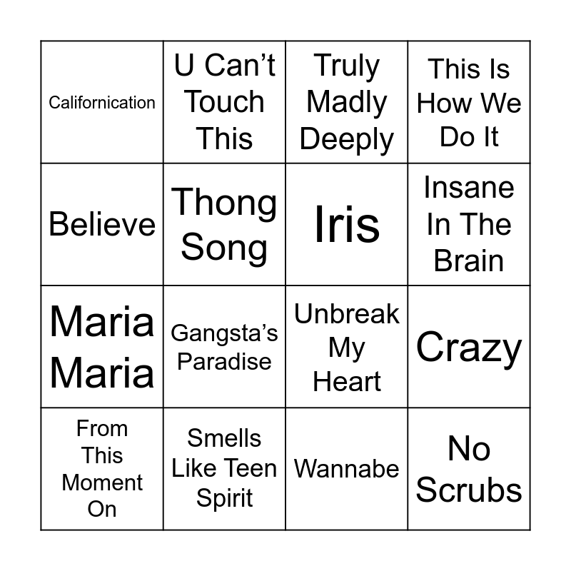 This bingo card has 45 words: Smooth, From This Moment On, Crazy, Let’s Get Loud, Personal Jesus, Torn, Truly Madly Deeply, You’re Still The One, Believe, Without You, This Is How We Do It, Smells Like Teen Spirit, I Will Always Love You, Don’t Speak, Zombie, The Next Episode, Wonderwall, Unbreak My Heart, Mambo No. 5, Gangsta’s Paradise, U Can’t Touch This, No Diggity, California Love, Californication, Livin’ La Vida Loca, Wannabe, My Heart Will Go On, All Star, The Bad Touch, No Scrubs, Genie In A Bottle, Song 2, Thank You, Be My Lover, You Sang To Me, Crazy, If You Had My Love, I’ll Be Missing You, My Name Is, Insane In The Brain, Thong Song, Maria Maria, Boombastic, Iris and Can’t Help Falling In Love.