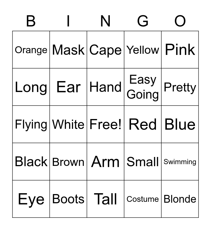 This bingo card has a free space and 39 words: Body, Hair, Face, Ear, Eye, Arm, Hand, Leg, Pink, Black, White, Yellow, Blonde, Blue, Red, Brown, Green, Orange, Big, Small, Long, Tall, Easy Going, Pretty, Cute, Muscly, Scary, Smart, Weapon, Mask, Helmet, Hat, Cape, Boots, Costume, Fighting, Swimming, Flying and Short.