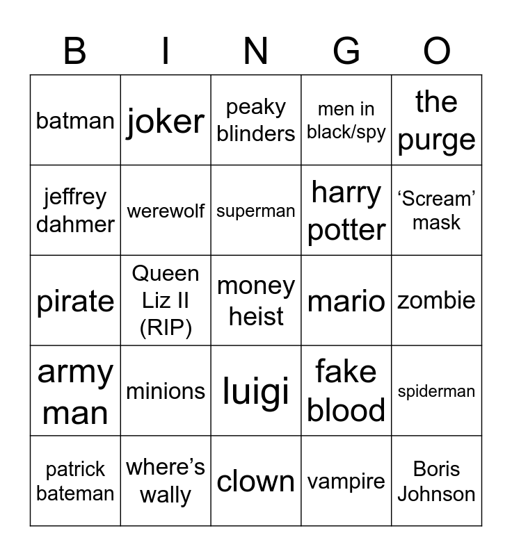 This bingo card has a free space and 24 words: minions, where’s wally, superman, patrick bateman, the purge, batman, jeffrey dahmer, joker, mario, luigi, harry potter, pirate, fake blood, spiderman, werewolf, vampire, zombie, peaky blinders, ‘Scream’ mask, Queen Liz II (RIP), Boris Johnson, army man, men in black/spy and clown.