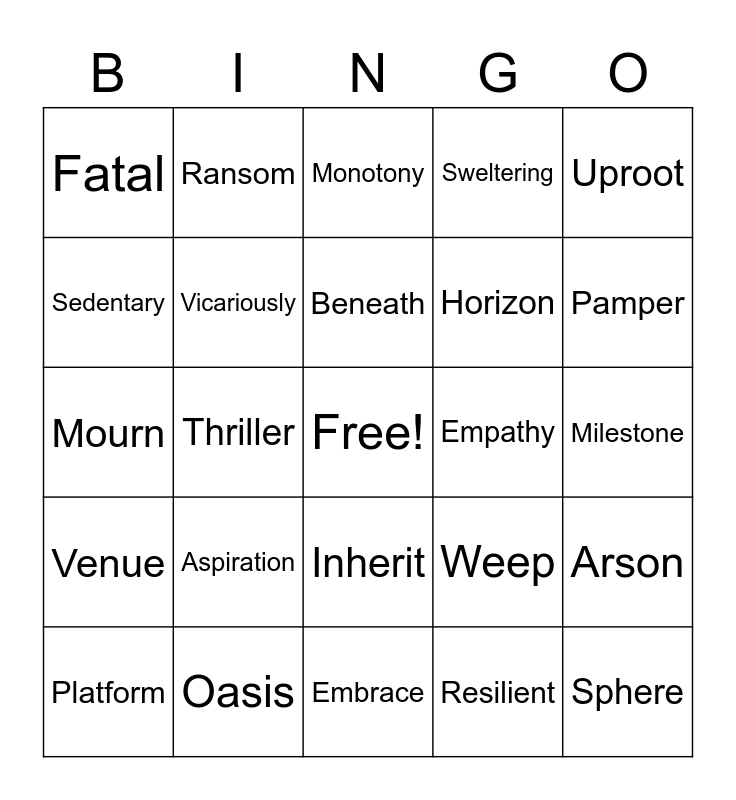 This bingo card has a free space and 29 words: Platform, Promote, Thriller, Pursuit, Fatal, Monotony, Vicariously, Aspiration, Empathy, Oasis, Milestone, Sphere, Embrace, Resilient, Pamper, Native, Inherit, Venue, Uproot, Mourn, Weep, Progressive, Horizon, Sedentary, Sweltering, Ransom, Arson, Beneath and Among.