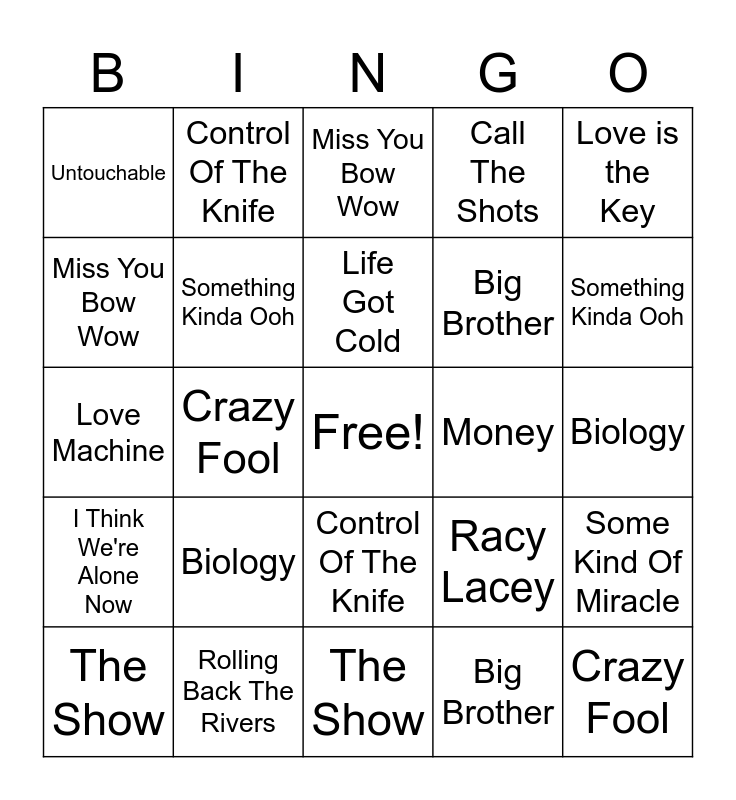 ⚠ This card has duplicate items: Walk This Way (5), Life Got Cold (5), Whole Lotta History (5), Real Life (5), I Think We're Alone Now (5), Jump (5), Sound Of The Underground (5), Untouchable (5), White Lies (5), Control Of The Knife (5), Long Hot Summer (5), Crazy Fool (5), Revolution in the Head (5), Here We Go (5), Girls Allowed (5), Fling (5), The Loving Kind (5), See The Day (5), Rolling Back The Rivers (5), Graffiti My Soul (5), I'll Stand By You (5), No Good Advice (5), Models (5), Big Brother (5), Biology (5), Love Machine (5), The Show (5), Miss You Bow Wow (5), Money (5), Waiting (5), Love is the Key (5), The Promise (5), You Freak Me Out (5), Call The Shots (5), Can't Speak French (5), Girl Overboard (5), Something Kinda Ooh (5), Watch Me Go (5), Wake Me Up (5), Racy Lacey (5), Some Kind Of Miracle (5), Sexy No No No (5)