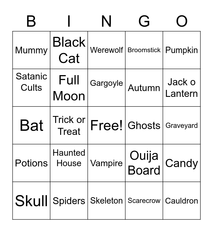 This bingo card has a free space and 24 words: Haunted House, Spiders, Gargoyle, Skull, Pumpkin, Mummy, Satanic Cults, Black Cat, Ghosts, Vampire, Autumn, Bat, Ouija Board, Candy, Full Moon, Scarecrow, Graveyard, Werewolf, Jack o Lantern, Trick or Treat, Cauldron, Potions, Broomstick and Skeleton.