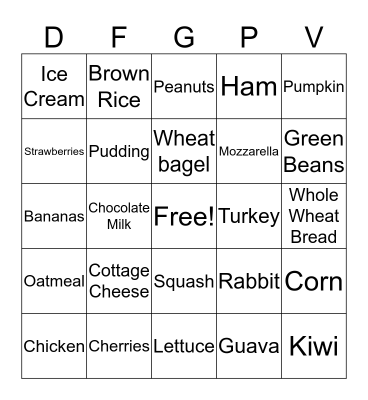 This bingo card has a free space and 24 words: Cottage Cheese, Cherries, Wheat bagel, Chicken, Pumpkin, Ice Cream, Strawberries, Brown Rice, Turkey, Squash, Mozzarella, Bananas, Rabbit, Corn, Pudding, Guava, Whole Wheat Bread, Peanuts, Green Beans, Chocolate Milk, Kiwi, Oatmeal, Ham and Lettuce.