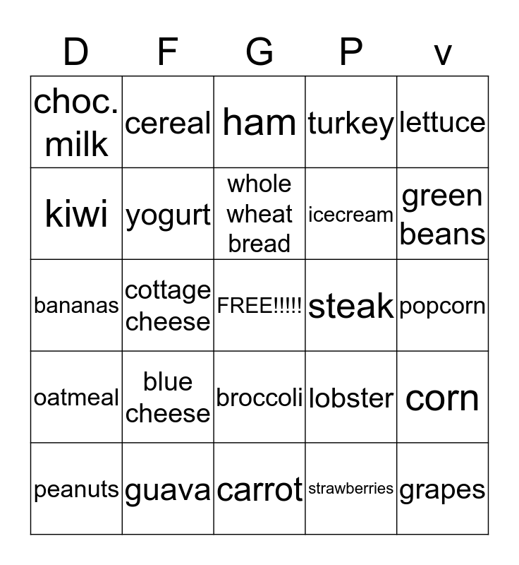 This bingo card has a free space and 24 words: blue cheese, guava, whole wheat bread, peanuts, lettuce, choc. milk, kiwi, cereal, steak, broccoli, icecream, bananas, lobster, corn, yogurt, strawberries, popcorn, ham, green beans, cottage cheese, grapes, oatmeal, turkey and carrot.