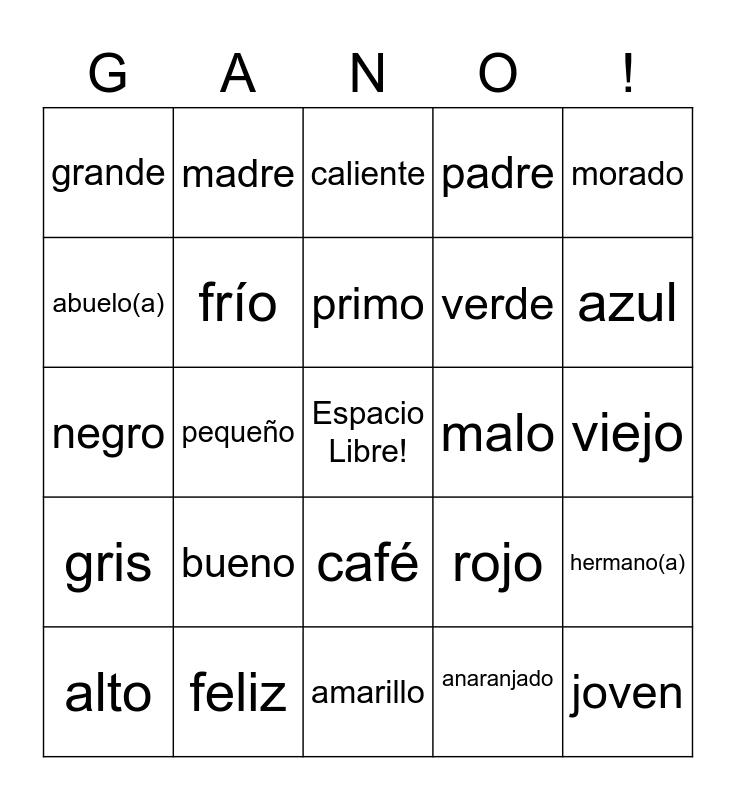 This bingo card has a free space and 29 words: alto, bajo, pequeño, mediano, grande, caliente, frío, bueno, malo, feliz, viejo, joven, amarillo, anaranjado, azul, blanco, café, gris, morado, negro, rojo, rosado, verde, abuelo(a), padre, madre, hermano(a), primo and tío.