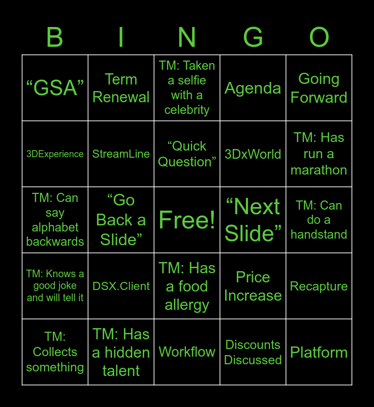 This bingo card has a free space and 50 words: Acquisition, Platform, Churn, Workflow, DSX.Client, Auto-Renewal, Term Renewal, First Year Renewal, 3DExperience, Platform, StreamLine, Agenda, Recapture, Price Increase, Integration, L.A.E.R, “Quick Question”, “Next Slide”, “Good Point”, Going Forward, “Go Back a Slide”, Discounts Discussed, “GSA”, 3DxWorld, TM: Lefthander, TM: Owns 5+ Houseplants, TM: Has run a marathon, TM: Has a pet, TM: Taken a selfie with a celebrity, TM: Has a food allergy, TM: Celebrating a birthday this month, TM: Bilingual, TM: Interesting Hobby, TM: Plays an instrument, TM: Has a hidden talent, TM: Has traveled over seas, TM: Currently reading a book, TM: Two or more tattoos, TM: Can tough tongue to nose, TM: Can do a handstand, TM: Has flown in a helicopter, TM: Is a Cher fan (other than Lynnette), TM: Does not like pizza, TM: Won a trophy, TM: Collects something, TM: Can say alphabet backwards, TM: That likes Star Wars, TM: Can whistle loudly, TM: Knows a good joke and will tell it and TM: Took a vacation this year.