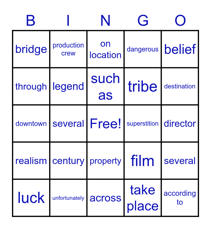 This bingo card has a free space and 55 words: culture, luck, actually, bridge, across, heaven, legend, point at, tribe, Central America, dangerous, past, disease, keep from, enter, strange, belief, several, country, according to, superstition, become, film, on location, recognize, such as, take place, rather, director, several, reason, appear, realistic, chase scene, through, downtown, add, realism, effective, for instance, production crew, recreate, ancient, instead, century, unfortunately, traffic, inconvenience, alternative, destination, concern, murder, complain, property and value.