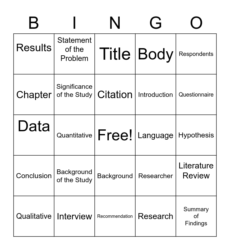 This bingo card has a free space and 24 words: Background of the Study, Interview, Citation, Qualitative, Respondents, Results, Chapter, Statement of the Problem, Language, Background, Introduction, Data, Researcher, Literature Review, Significance of the Study, Research, Hypothesis, Title, Questionnaire, Quantitative, Summary of Findings, Conclusion, Body and Recommendation.