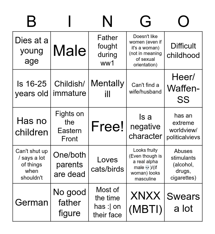 This bingo card has a free space and 24 words: One/both parents are dead, No good father figure, Mentally ill, German, Difficult childhood, Dies at a young age, Is 16-25 years old, Male, Is a negative character, Loves cats/birds, Can't find a wife/husband, Has no children, Looks fruity (Even though is a real alpha male💀)/(if woman) looks masculine, Abuses stimulants (alcohol, drugs, cigarettes), Childish/ immature, XNXX (MBTI), has an extreme worldview/ politicalvievs, Father fought during ww1, Heer/ Waffen-SS, Fights on the Eastern Front, Swears a lot, Can't shut up / says a lot of things when shouldn't, Doesn't like women (even if it's a woman) (not in meaning of sexual orientation) and Most of the time has :| on their face.