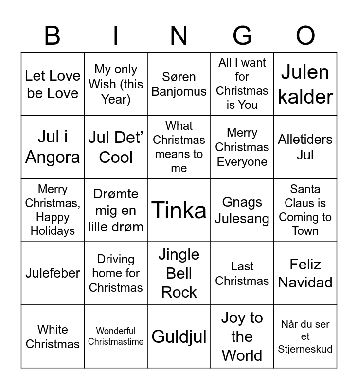 This bingo card has 65 words: Free!, Jesus & Josefine, Sante Tell Me, Feliz Navidad, Mistletoe, Happy Xmas (War is over), My only Wish (this Year), Sleigh Ride, What Christmas means to me, I en stjerneregn af sne, Jingle Bell Rock, Thank God it’s Christmas, Santa Claus is Coming to Town, Julen kalder, Underneath the Tree, Jul i Angora, Drømte mig en lille drøm, Let Love be Love, Rockin’ around the Christmas Tree, Merry Christmas Everyone, Driving home for Christmas, Julefeber, All I want for Christmas is You, Når sneen falder, Merry Xmas Everybody, Do they know it’s Christmas, I wish it could be Christmas Everyday, Run Run Rudolph, Tinka, Christmas Rappin', White Christmas, It’s beginning to look a lot like Christmas, It’s the most Wonderful Time of the Year, Let it Snow! Let it Snow! Let it Snow!, Last Christmas, Wonderful Christmastime, Like it’s Christmas, Merry Christmas, Happy Holidays, Joy to the World, Christmas Tree, Jul Det’ Cool, Man with the Bag, Gnags Julesang, Mary’s Boy Child, Der’ noget i December, Den Himmelblå, Alletiders Jul, Cool Jul, Når du ser et Stjerneskud, Lille store verden, Nu er det jul, Kongespil, Decembersang (det sørme), Guldjul, Jul på Vesterbro, Til julebal i Nisseland, Det er risengrød, Søren Banjomus, I saw Mommy kissing Santa Claus, The Støvle Dance, Santa Baby, Penge, Når vi først går i gang, Skal vi ikke lave en snemand? and Finally it’s Christmas again.