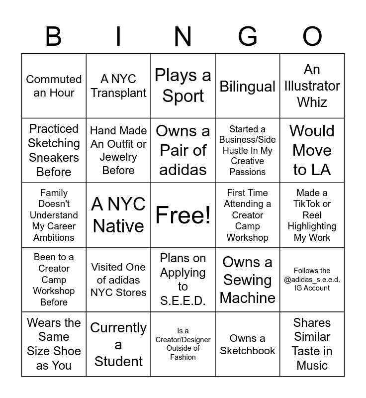 This bingo card has a free space and 24 words: Visited One of adidas NYC Stores, Currently a Student, Owns a Pair of adidas, Wears the Same Size Shoe as You, An Illustrator Whiz, Commuted an Hour, Practiced Sketching Sneakers Before, A NYC Transplant, First Time Attending a Creator Camp Workshop, Plans on Applying to S.E.E.D., Started a Business/Side Hustle In My Creative Passions, Family Doesn't Understand My Career Ambitions, Owns a Sewing Machine, Follows the @adidas_s.e.e.d. IG Account, Hand Made An Outfit or Jewelry Before, Owns a Sketchbook, Made a TikTok or Reel Highlighting My Work, Plays a Sport, Would Move to LA, A NYC Native, Shares Similar Taste in Music, Been to a Creator Camp Workshop Before, Bilingual and Is a Creator/Designer Outside of Fashion.